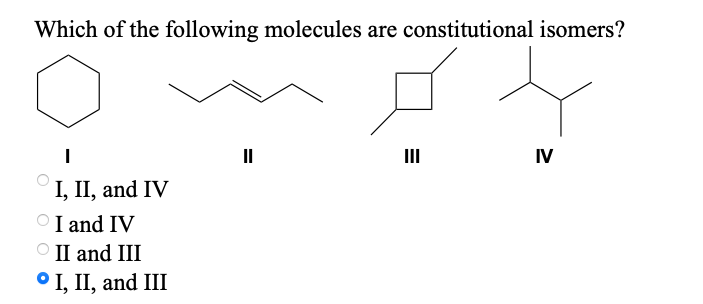 Which of the following molecules are constitutional isomers. II IV I II and IV I and IV II and III I II and III. They both have exactly the same atoms in the same ratios in the molecule.